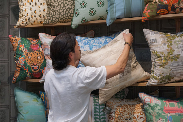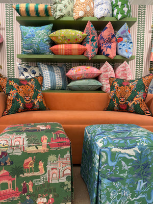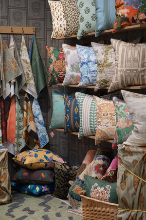 Explore our collection of made-to-order pillows, rugs, fabrics, and wallpaper — see the craftsmanship up close, feel the textures, and discover how each piece can be customized for your next project.